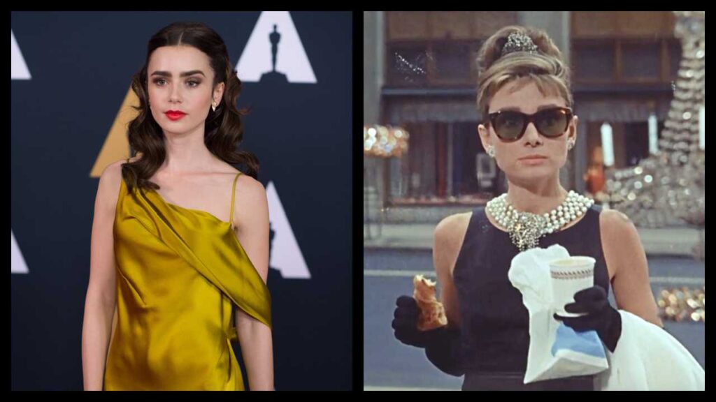(Слева) Лили Коллинз присутствует на 8-й ежегодной церемонии вручения премии Губернатора Академии в бальном зале Ray Dolby в Hollywood & Highland Center® в Голливуде, Калифорния, в субботу, 12 ноября 2016 г. Автор/поставщик: Аарон Пул / ©AMPAS Авторские права: ©AMPAS (Справа) Одри Хепберн в фильме «Завтрак у Тиффани». Фото: Парамаунт Пикчерз.