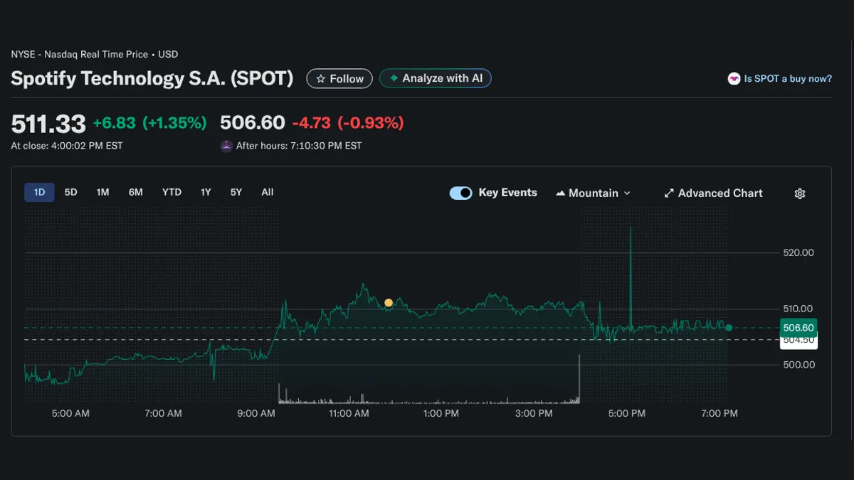 A son honneur, SPOT a connu une hausse (quoique modérée) cette semaine après les événements ça avait l’air désastreux avant le week-end dernier. Le titre est tombé en dessous de 500 dollars mais a réussi à rebondir jusqu’à un peu plus de 511 dollars à la clôture du marché mardi. Ce n’est pas fantastique, surtout si l’on compare le cours de clôture de lundi dernier à 530 $. Mais cela est dû en grande partie aux hausses de prix généralisées largement attendues aux États-Unis (ainsi qu’en Estonie et en Lettonie).