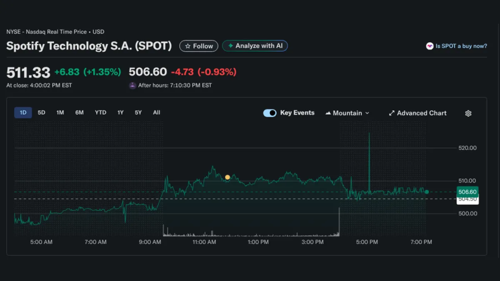 A son honneur, SPOT a connu une hausse (quoique modérée) cette semaine après les événements ça avait l’air désastreux avant le week-end dernier. Le titre est tombé en dessous de 500 dollars mais a réussi à rebondir jusqu’à un peu plus de 511 dollars à la clôture du marché mardi. Ce n’est pas fantastique, surtout si l’on compare le cours de clôture de lundi dernier à 530 $. Mais cela est dû en grande partie aux hausses de prix généralisées largement attendues aux États-Unis (ainsi qu’en Estonie et en Lettonie).