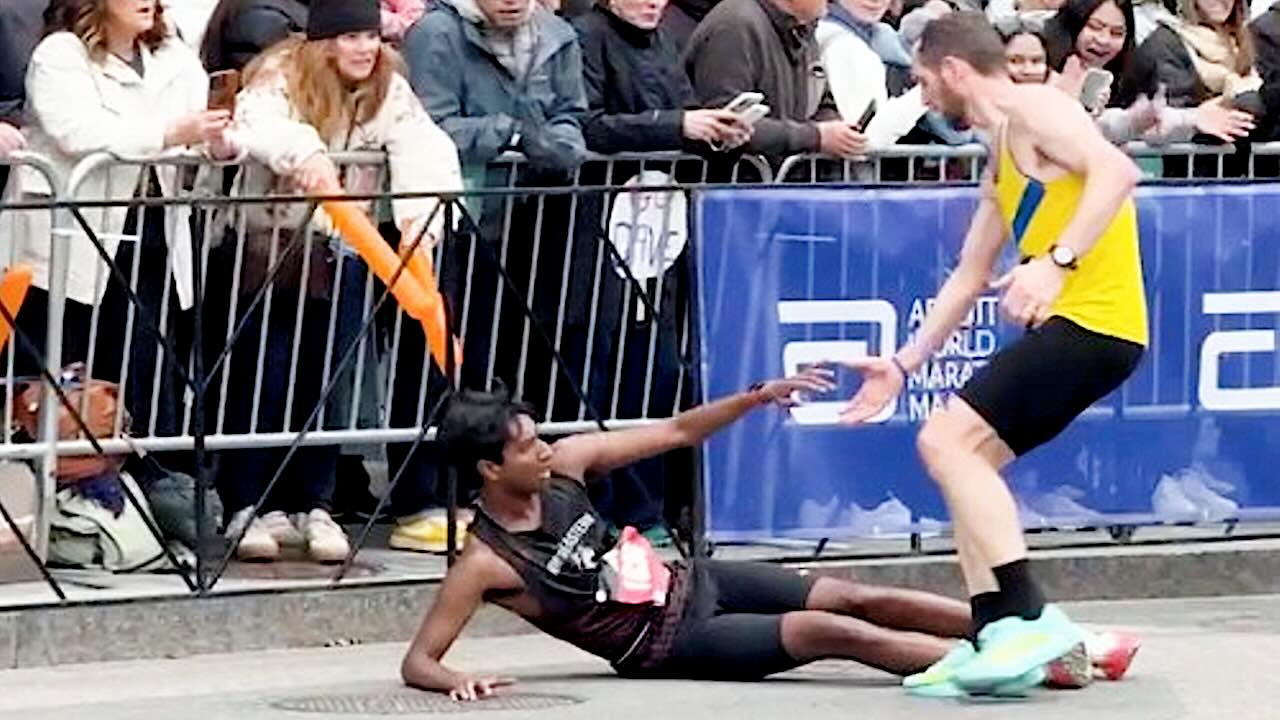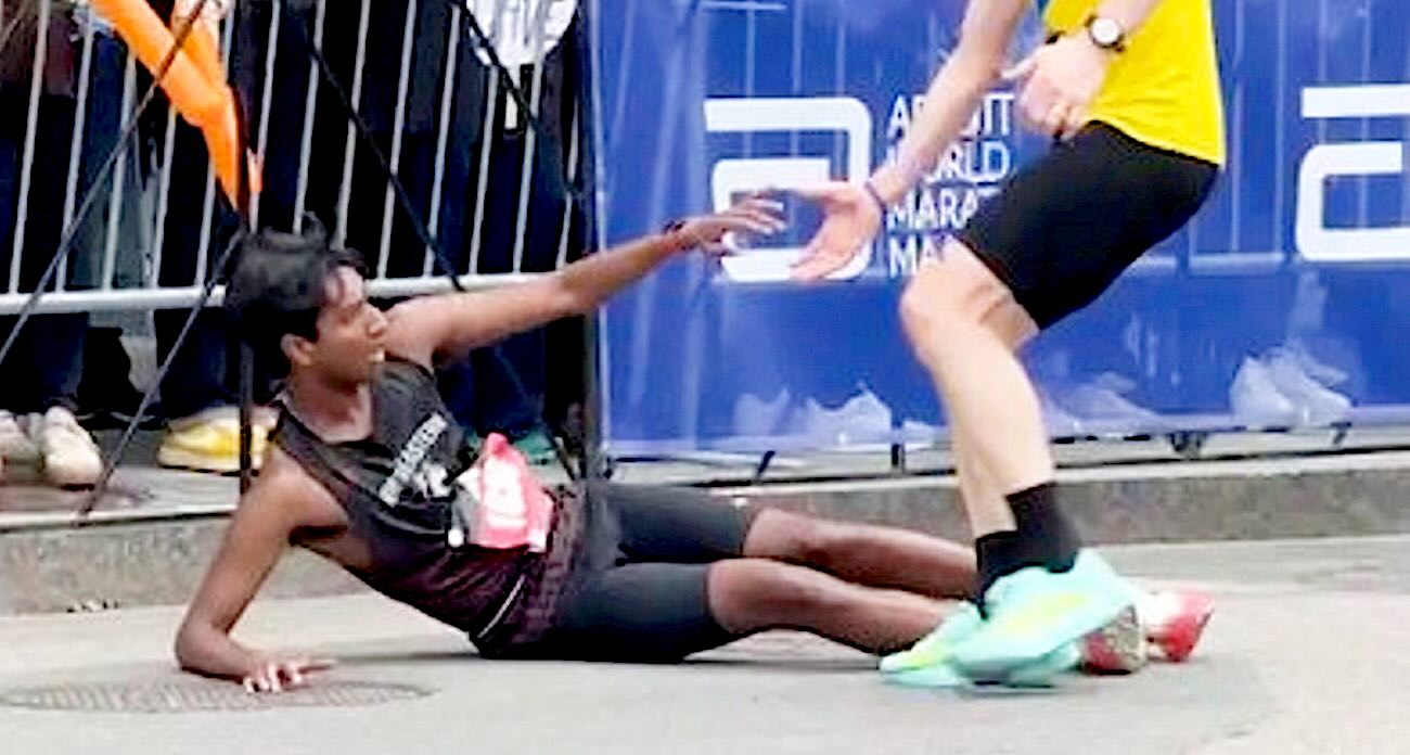 Hän kertoi huomanneensa mustaan toppiin pukeutuneen juoksijan yhtäkkiä pysähtyneen ja ryömivän kivusta ja kouristuksen vuoksi lihaksissaan. Kun useat urheilijat juoksivat ohi, kaksi kilpailijaa päätti pysähtyä ja auttaa.
