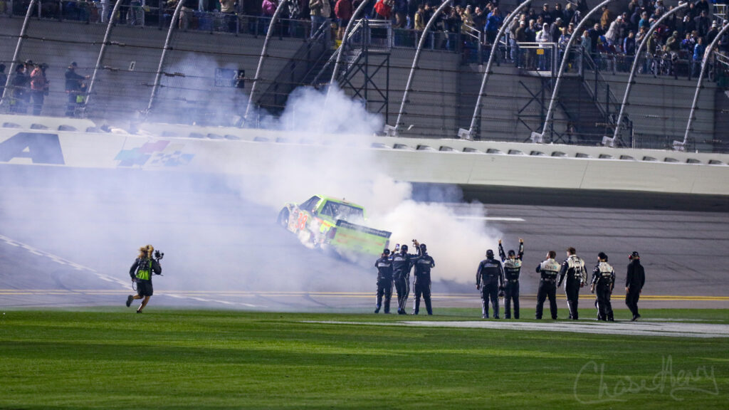 Epäonnistuttuaan sunnuntain Daytona 500 -kilpailuun, Chandler Smith nousi kuorma-autosarjan ruudulliseen lippuun jännittävässä neljän leveyden maalissa ja voitti kolmannen Daytona-voiton no. 38 Front Row Motorsports F-150 -autolla viimeisen viiden vuoden aikana.