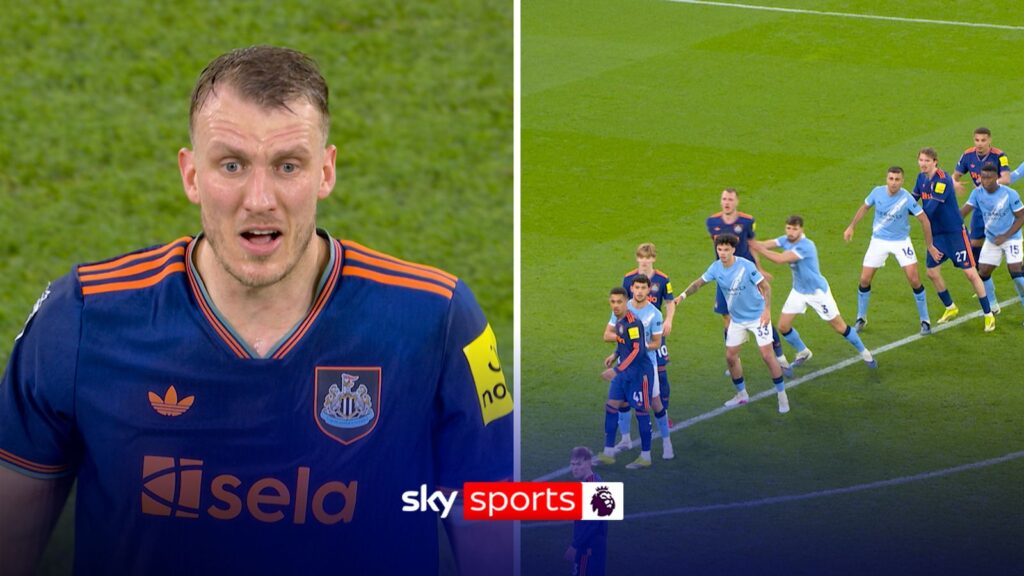 Manchester Cityn Ruben Dias työntää Newcastle Unitedin Dan Burnin paitsioasentoon juuri ennen kuin puolustaja pääsi maaliin.