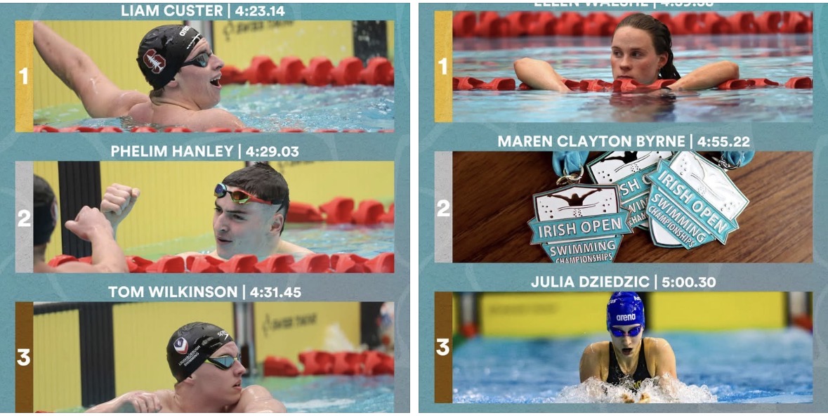 Avoimessa 400 metrin sekauinnissa Liam Custer vaati kultaa 4:23.14saavuttaa U23-eurooppalaisen standardin, kun taas Phelim Quirks varmisti Euroopan junioriajan toiseksi.