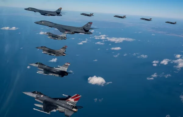 Ang mga F-16 mula sa 51st Fighter Wing ay sumali sa B-1B bombers at Republic of Korea F-35A aircraft sa isang joint training flight sa Korean Peninsula. Larawan/U.S. Air Force/Staff Sgt. Dwane Young