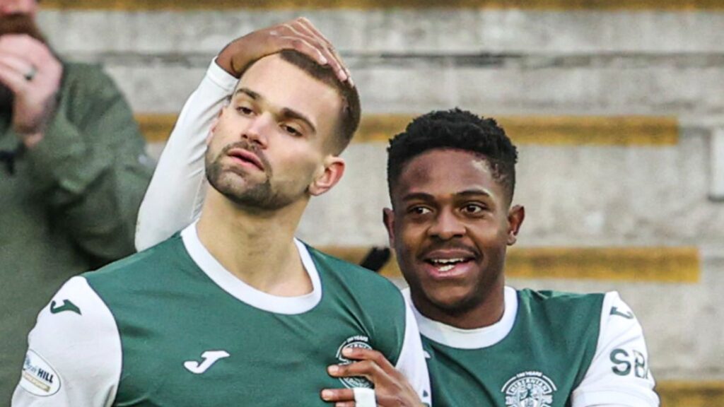 Nicky Cadden nousi ylös takatolpalle ja Felix Passlack löi volleyn tolpasta. Kulma oli saksalaista vastaan, mutta Hibsin pomo David Gray olisi ainakin odottanut oikeanpuoleisen osuvan maaliin.