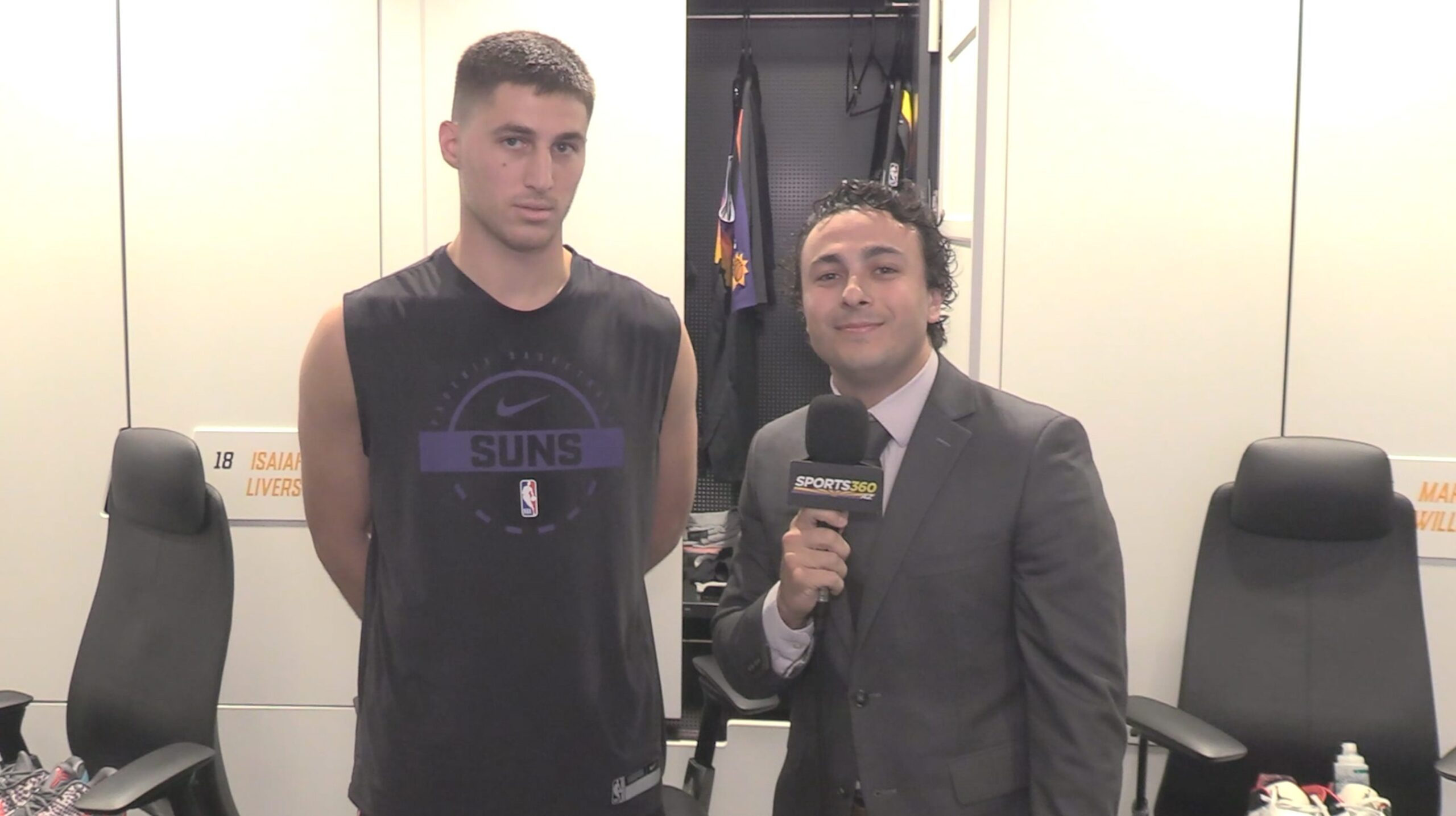 Eliav Gabay keskustelee pukuhuoneessa Phoenix Sunsin vartijan Collin Gillespieen kanssa Sunsin yhden kauden kolmen pisteen ennätyksen asettamisesta, hänen parannetuista pelistään ja siitä, kuinka Suns valmistautuu Play-In-otteluun.
