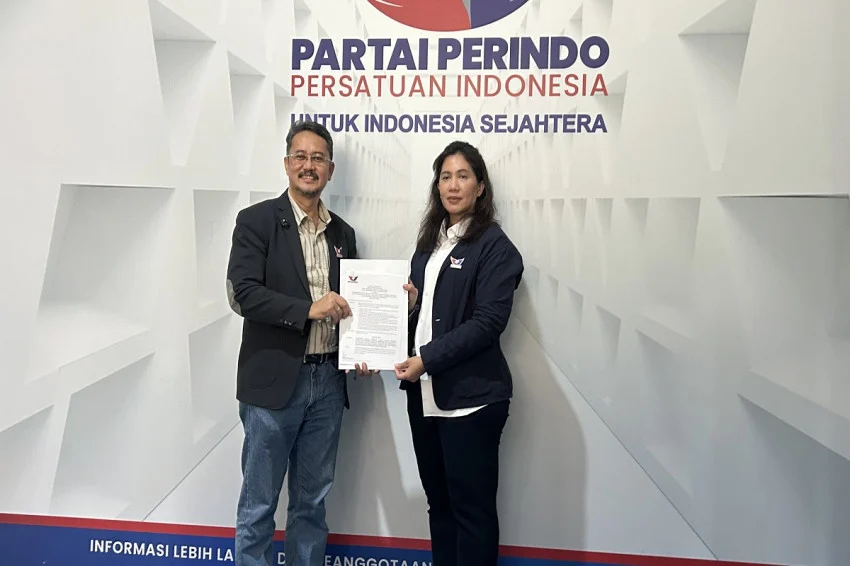 Ibinigay ni Secretary General ng Partido Perindo DPP Ferry Kurnia Rizkiyansyah ang Dekreto mula sa Central Leadership Council (SKDPP) sa Tagapangulo ng Jambi Perindo Party na si DPW Christina Glorya Purba, Lunes (23/2/2026). Larawan: Annastasya