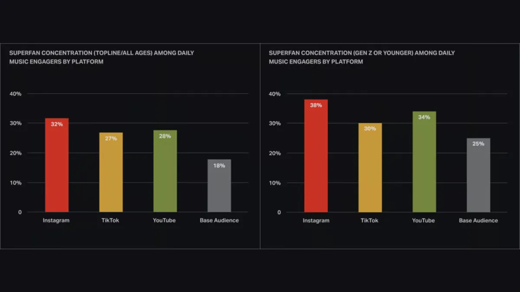 Selon l’étude de Luminate, superfans sont définis comme des consommateurs qui « tirent cinq des 13 leviers d’engagement différents auprès d’un artiste ». Ceux-ci incluent la participation à des concerts, le soutien sur Patreon et le bouche-à-oreille. Sans surprise, l’étude révèle que la plus forte concentration de ces superfans se trouve sur Instagram.