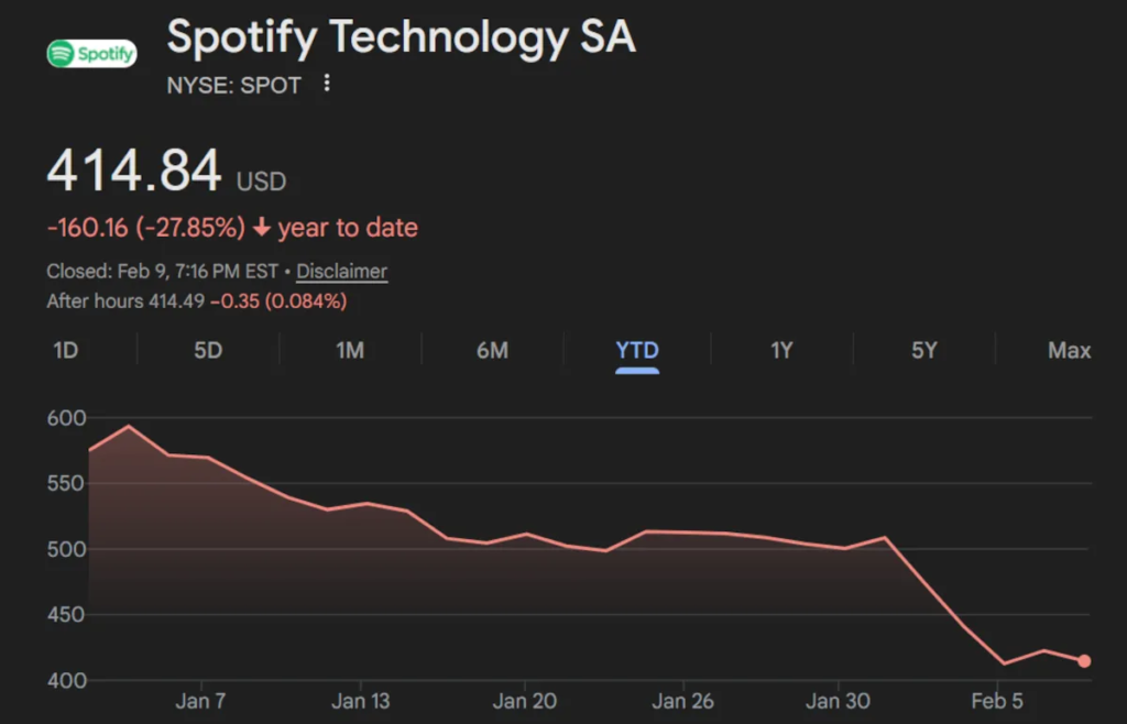 Premièrement, l’accent mis par le marché sur la rentabilité continue est assez clair ; La dernière descente de SPOT remonte peu après le deuxième trimestre 2025, lorsque l’entreprise cassé sa séquence de rentabilité et a fait chuter les actions depuis un sommet de juin à 785 $ l’unité.