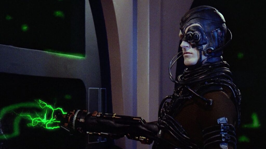 Il convient de noter que le design et la présentation du Borg sont à l’opposé de la compassion. Les drones Borg ne parlent pas, n’ont pas d’expressions faciales et leurs corps sont incrustés de tubes et de machines. Leurs vaisseaux ne sont ni élégants ni esthétiques, mais des cubes géants constitués de pièces de plomberie et de motos. Même si l’on ne veut pas considérer les Borgs comme des méchants, il faut quand même accepter qu’ils sont, comme le décrit Q (John de Lancie), les utilisateurs ultimes. Ils prennent et absorbent simplement ce dont ils ont besoin dans la galaxie et tuent le reste.