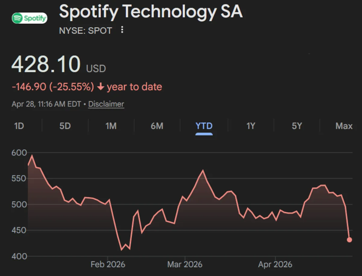 La valeur de l’action Spotify a chuté d’environ 9 % en début de séance, et lorsque cet article a été publié, les actions oscillaient autour de 428 $ l’unité (en baisse de 13 % sur la journée).