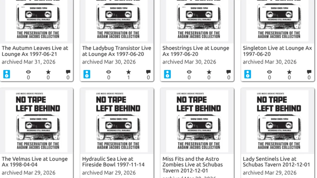 Depuis 1984, un fan de musique nommé Aadam Jacobs enregistre des enregistrements audio de sets de groupes émergents, principalement à Chicago. Aujourd’hui, grâce à un groupe de bénévoles aux États-Unis et en Europe, ces enregistrements sont méthodiquement cataloguénumérisé et téléchargé aux archives Internet.