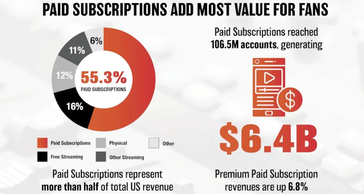 Encourageant au vu des augmentations de prix et de différents facteurs, le pourcentage et le total de l’abonnement s’alignent plus ou moins avec les données DMN Pro. Sans surprise, les revenus Premium à la demande ont bondi de 6,8 % sur un an pour atteindre 5,88 milliards de dollars, représentant ainsi plus de la moitié des revenus totaux enregistrés du principal marché de la musique.