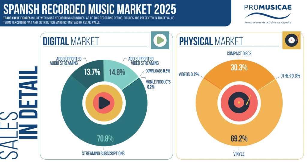 Plus de 21 millions de personnes en Espagne ont utilisé des services de streaming audio en 2025, dont plus de 8 millions ont payé un abonnement. Promusicae affirme que la pénétration du streaming payant reste inférieure aux marchés de référence, avec une grande marge de croissance. Même si le streaming musical payant connaît une croissance lente, les ventes physiques de vinyles sont en plein essor dans la région.