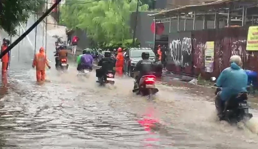 Ang malakas na ulan na bumuhos sa DKI Jakarta mula Sabado (7/3/2026) ng gabi hanggang Linggo (8/3/2026) ng madaling araw ay nagdulot ng pagbaha sa ilang mga punto. Larawan: Doc SindoNews/Ravie Mulia Wardani