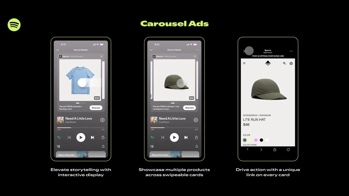 Spotify déploie des publicités carrousel interactives pour attirer plus d’argent marketing, se qualifiant d’« écosystème multiformat interactif » dans sa nouvelle ère.