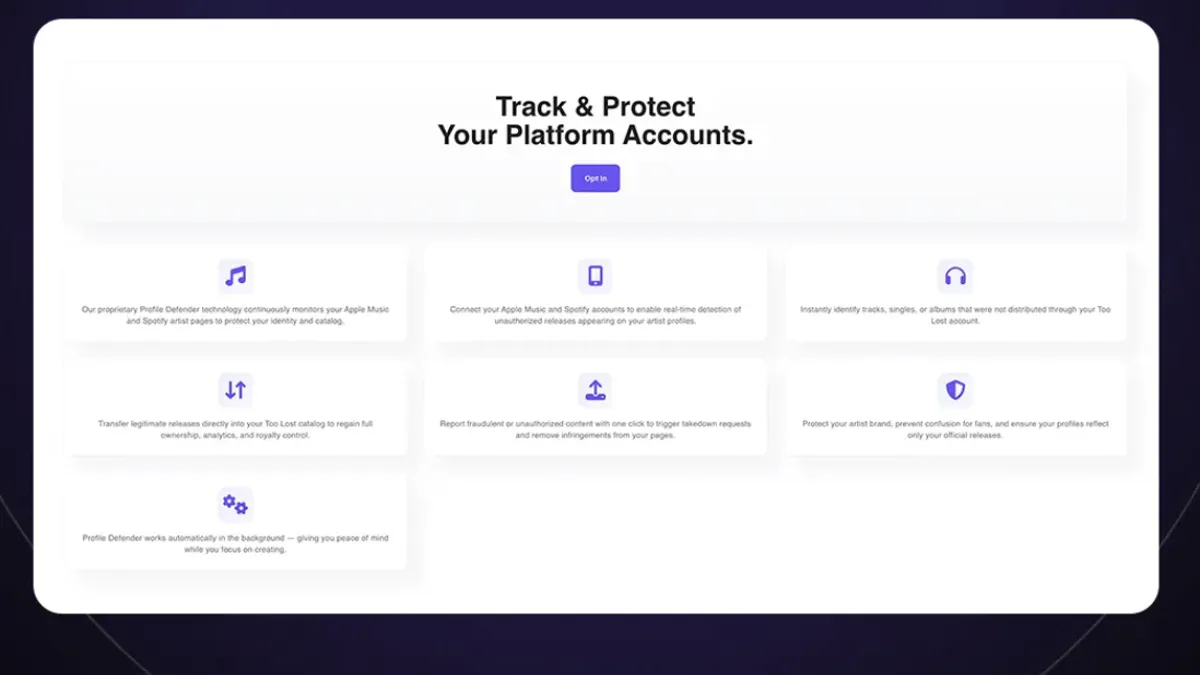 Défenseur de profil de Too Lost la nouvelle fonctionnalité « Profile Defender » offre exactement cette protection à ses artistes. Cette fonctionnalité permet aux artistes et aux titulaires de droits de surveiller et d’empêcher l’apparition de contenus non autorisés sur des DSP comme Apple Music et Spotify. Si un matériau non approuvé fait surface, le système alerte instantanément les utilisateurs, permettant un retrait rapide avant qu’une confusion du ventilateur ou des dommages algorithmiques ne se produisent.