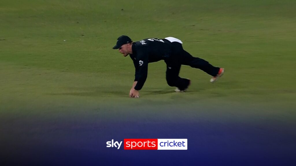 Uuden-Seelannin kenttäpelaaja Glenn Phillips ottaa tämän tainnutuksen poistaakseen Jacob Bethellin!