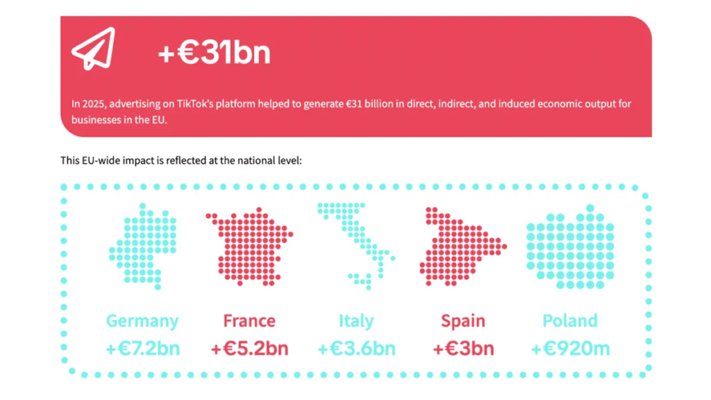 Selon un nouvelle étude menée par le cabinet d’analyse économique indépendant Public First (et commandé par TikTok), les entreprises faisant de la publicité sur TikTok ont généré 31 milliards d’euros (36 milliards de dollars) de production économique dans l’ensemble de l’UE en 2025. Cela comprend 2,6 milliards d’euros pour l’économie créative et 1,8 milliard d’euros spécifiquement dans l’industrie musicale de l’UE.