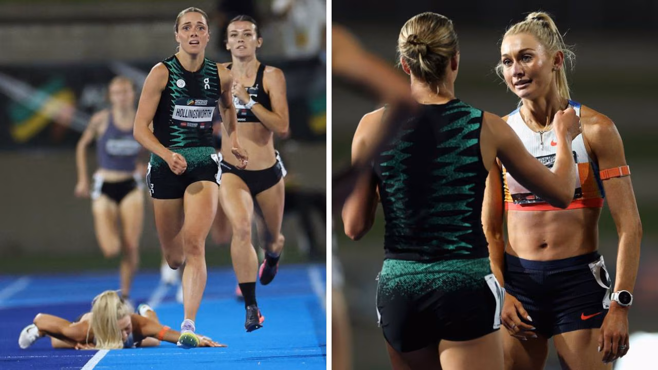 29-vuotias, joka voitti hopeaa Pariisin kisoissa, johti noin 60 metriä jäljellä, mutta kosketti sitten Claudia Hollingsworthin jalkaa ja kaatui maahan valitettavalla hetkellä.