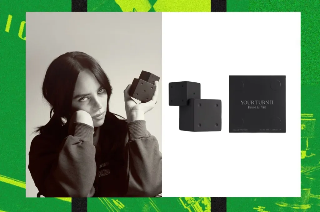 Le nouveau parfum de Billie Eilish Your Turn II en forme de deux dés imbriqués. Ce parfum est parfumé de baie de piment, de mirabelle et de feuilles de cassis.