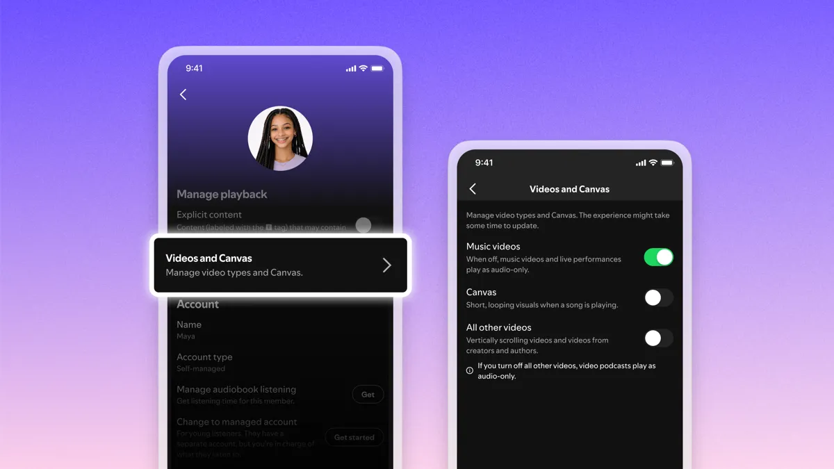Spotify est présentation de nouvelles commandes vidéo qui permettent aux utilisateurs de désactiver le contenu vidéo, y compris les clips vidéo ou les podcasts vidéo, ainsi que les visuels en boucle Canvas. Les bascules seront disponibles pour les comptes personnels et familiaux.